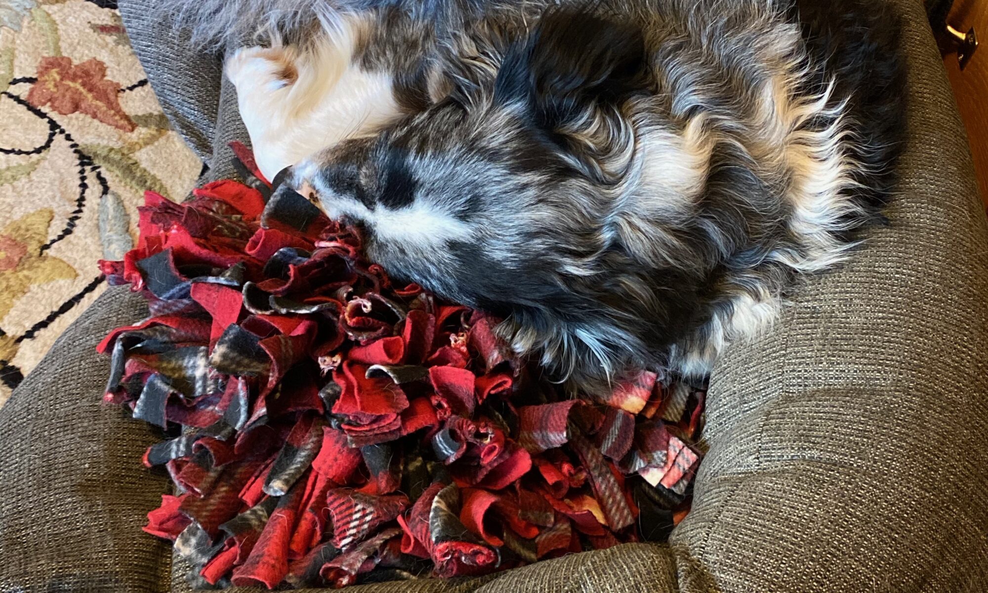 Directions: Cut the fleece into strips, about 1″ wide and 8 to 10” long. Thread a strip through each hole in the sink mat and tie it off. Make sure that you have tied a strip through every single hole in both directions. Viola! – snuffle mat!
